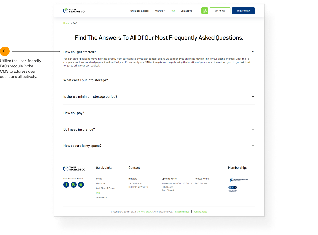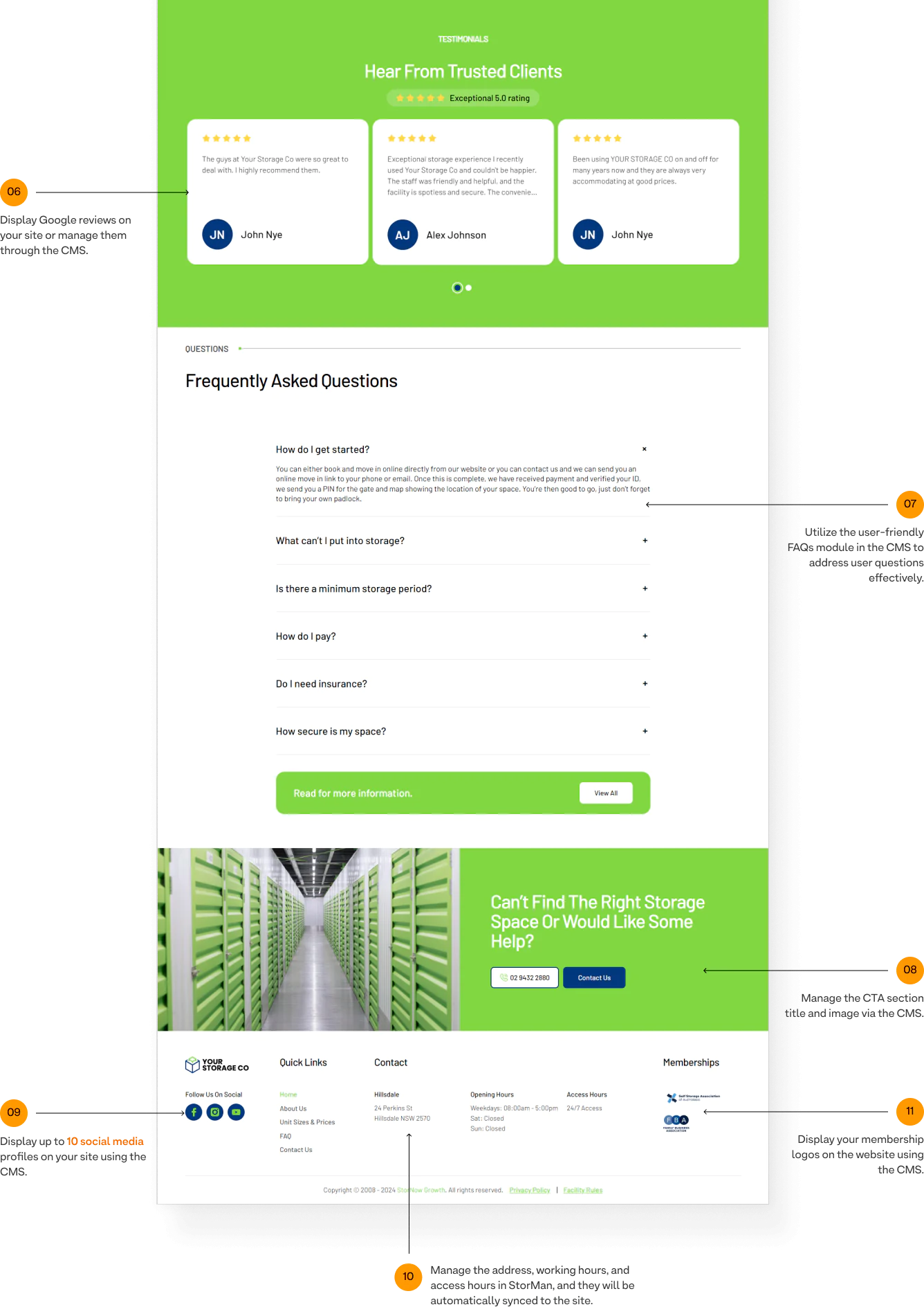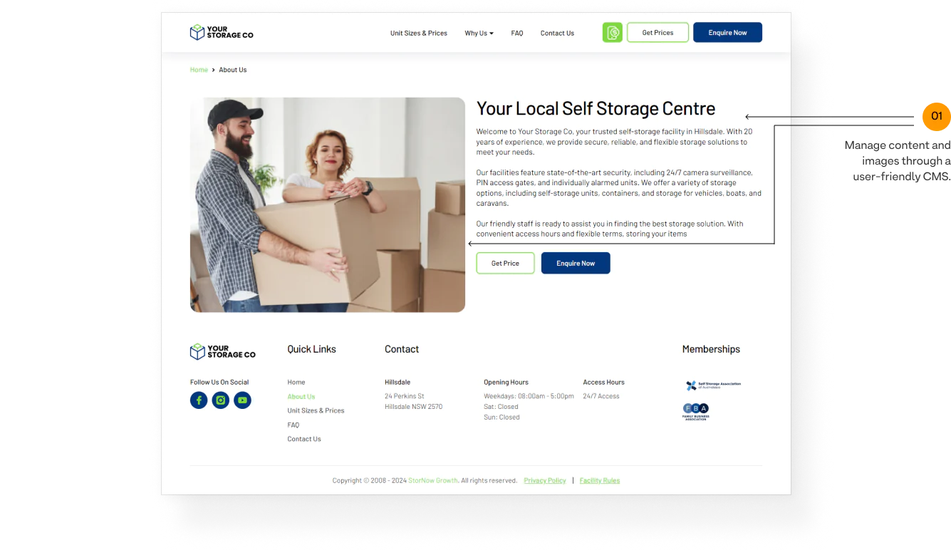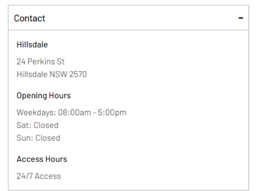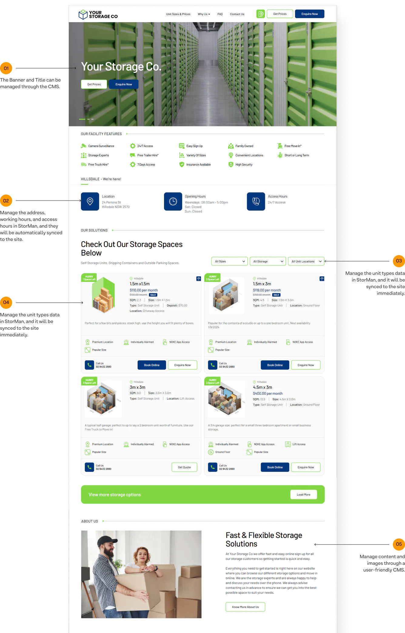 Manage the address, working hours, and access hours in StorMan, and they will be automatically synced to the site.