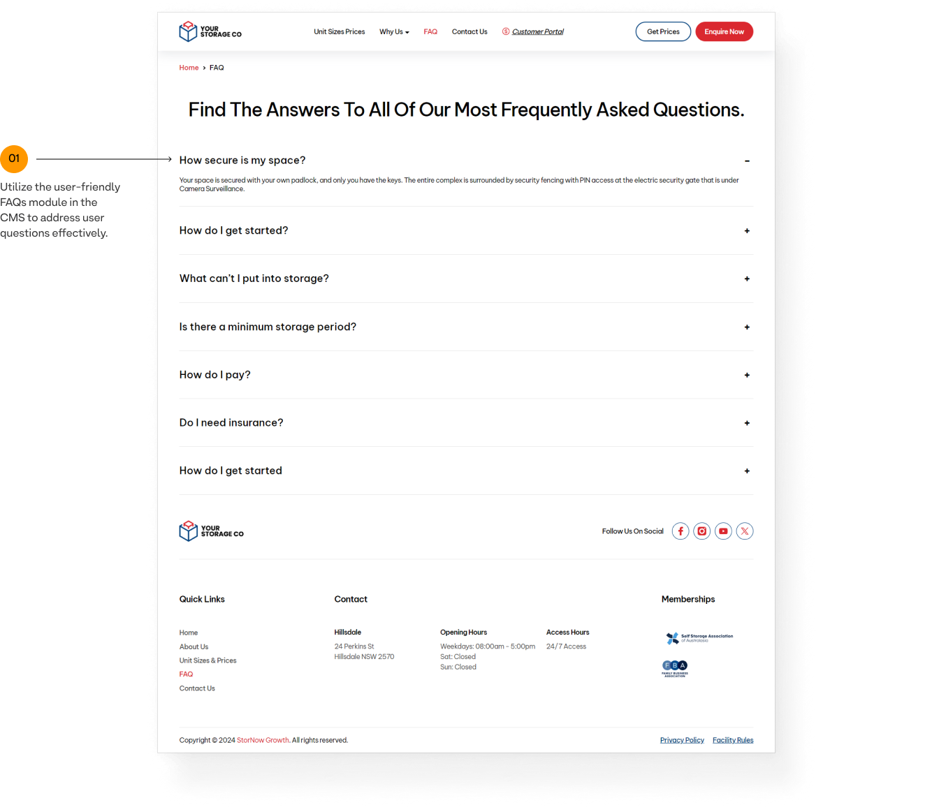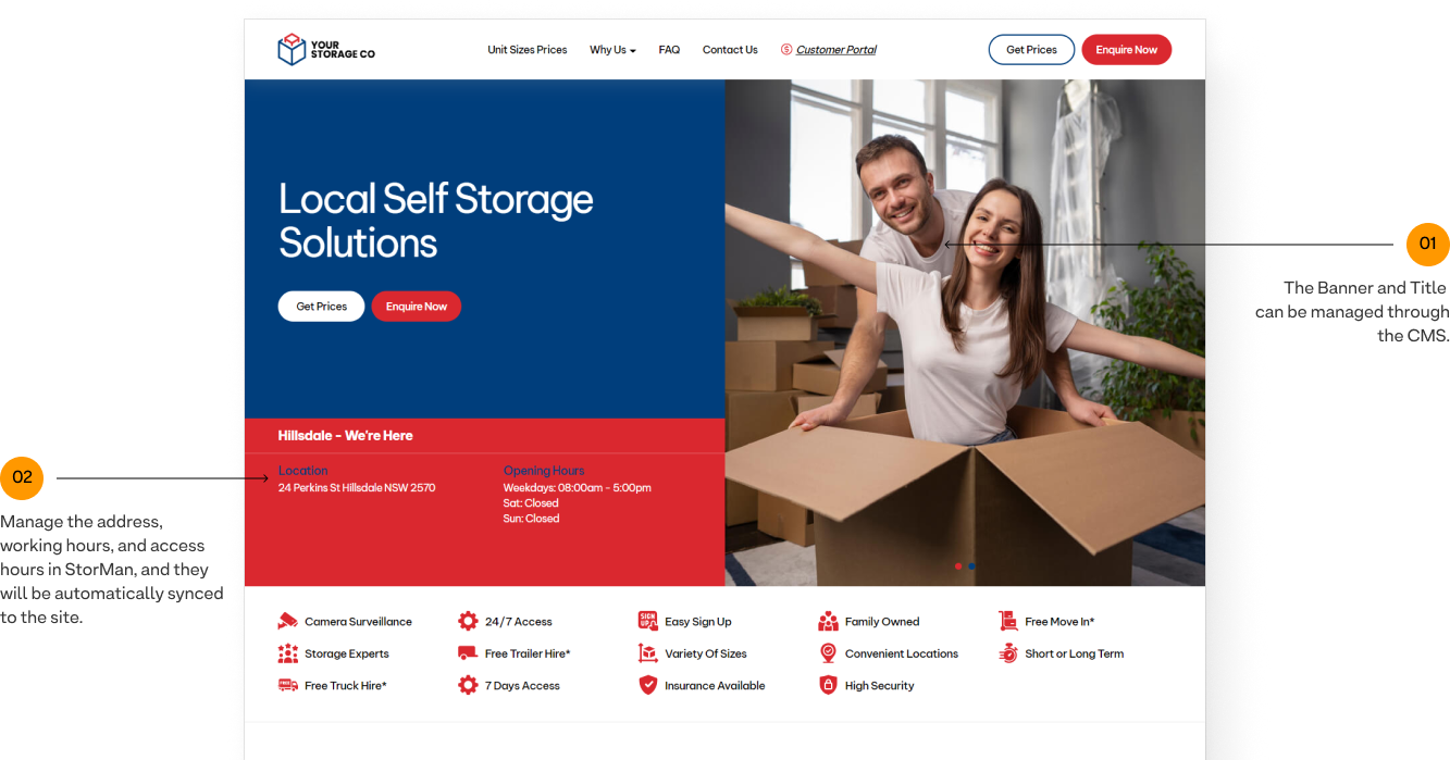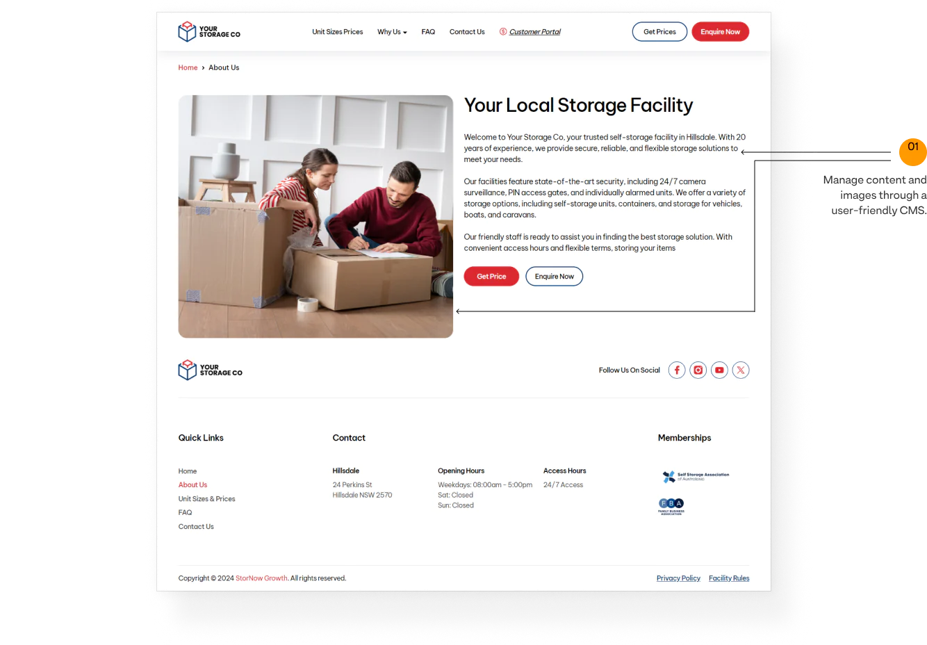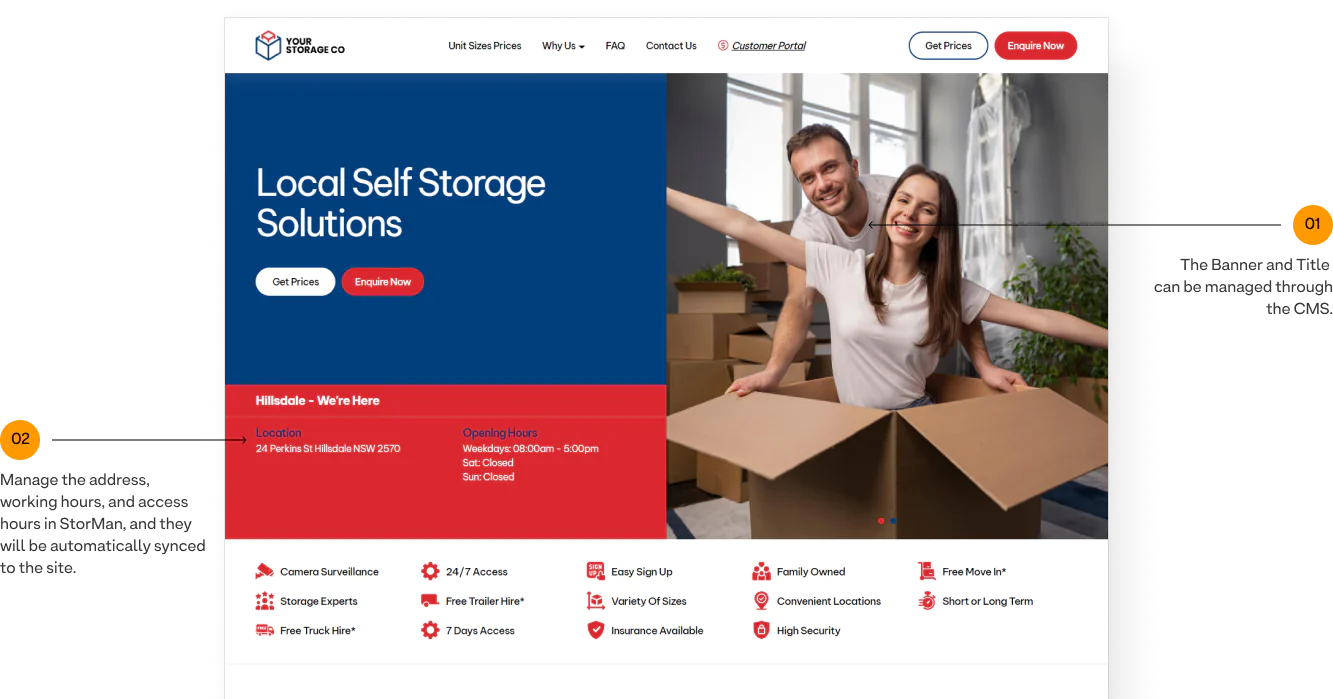Manage the address, working hours, and access hours in StorMan, and they will be automatically synced to the site.