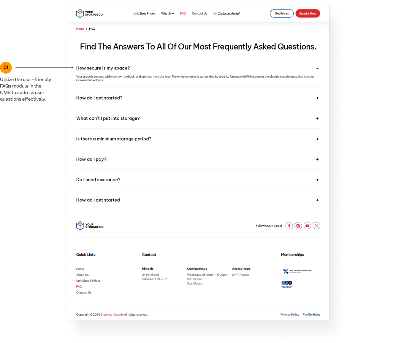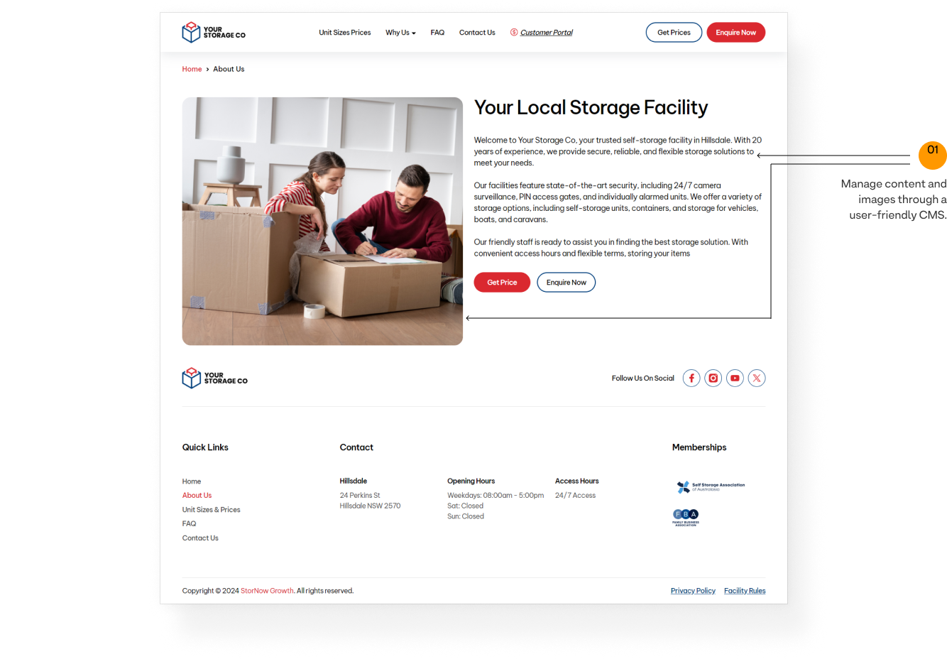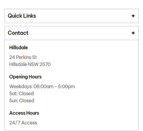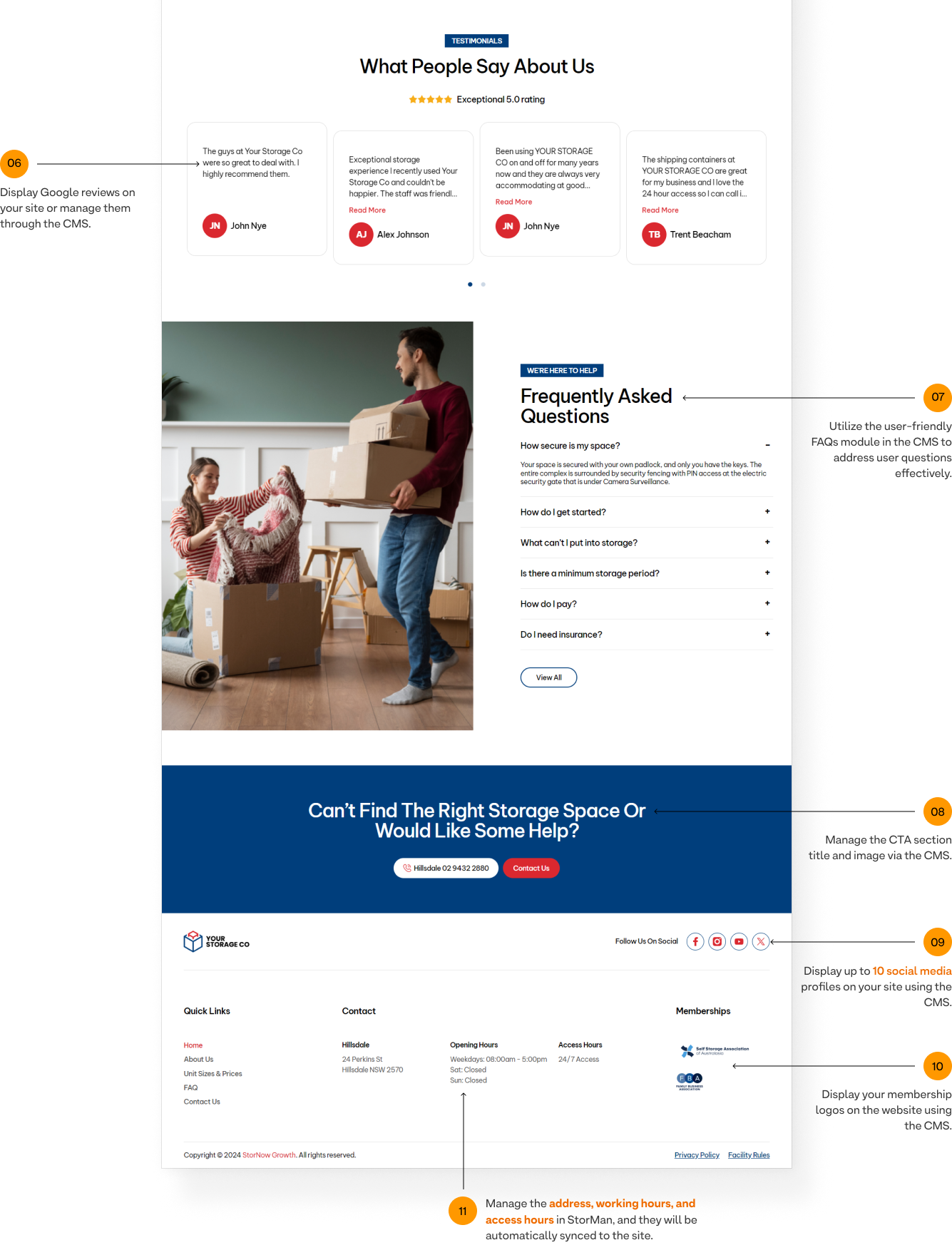 Manage the address, working hours, and access hours in StorMan, and they will be automatically synced to the site.