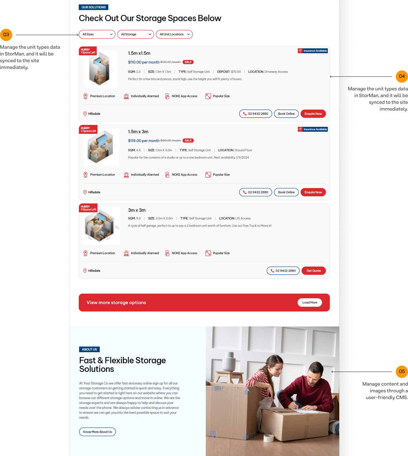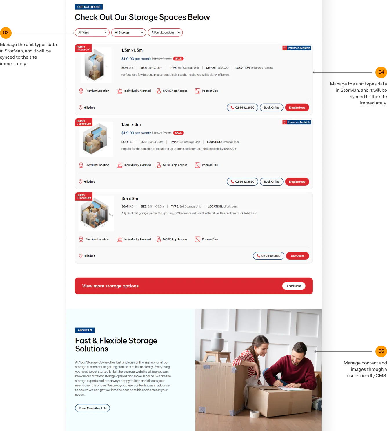 Manage the unit types data in StorMan, and it will be synced to the site immediately.