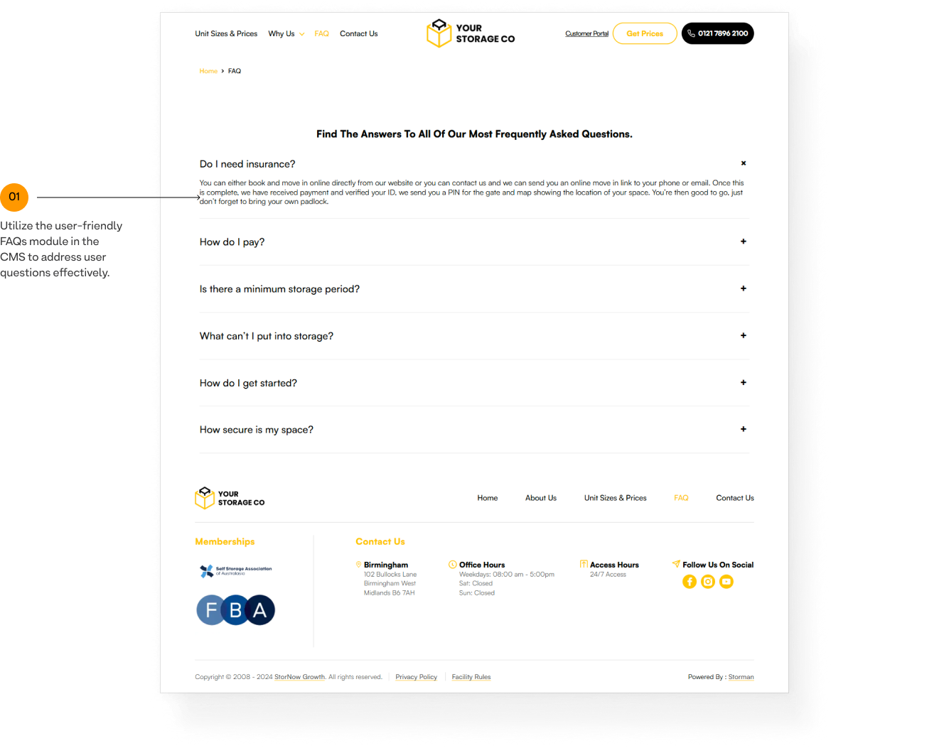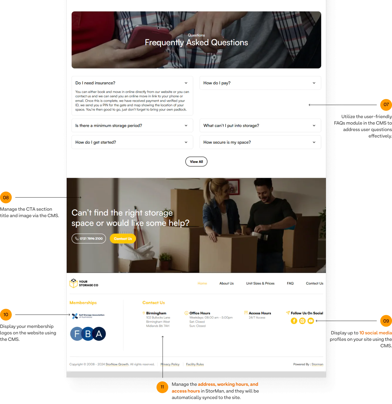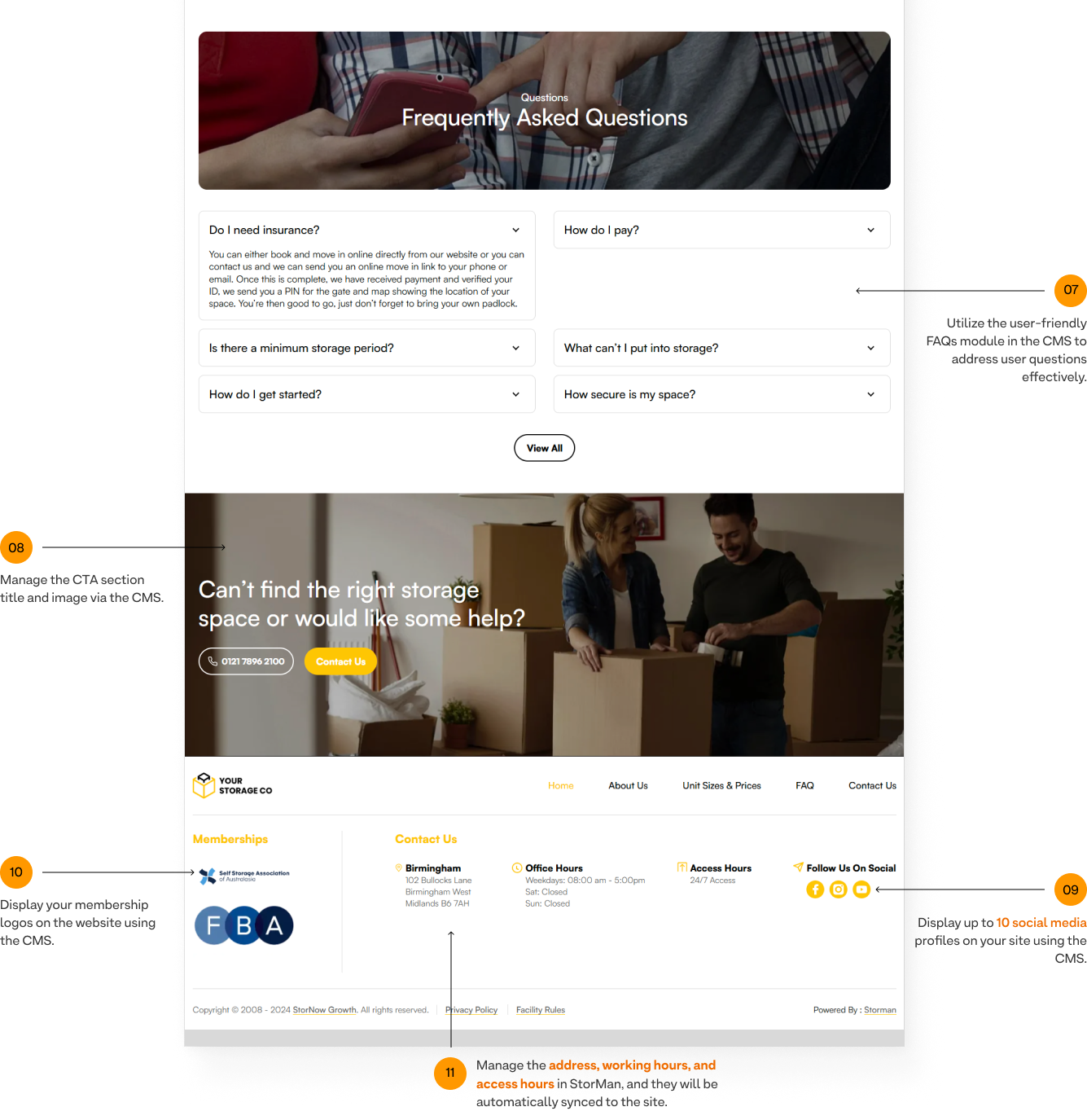 Manage the address, working hours, and access hours in StorMan, and they will be automatically synced to the site.