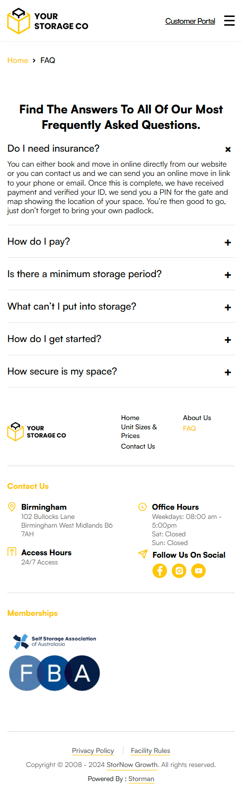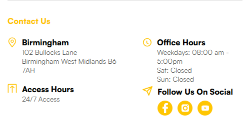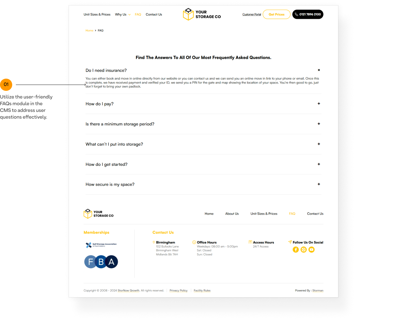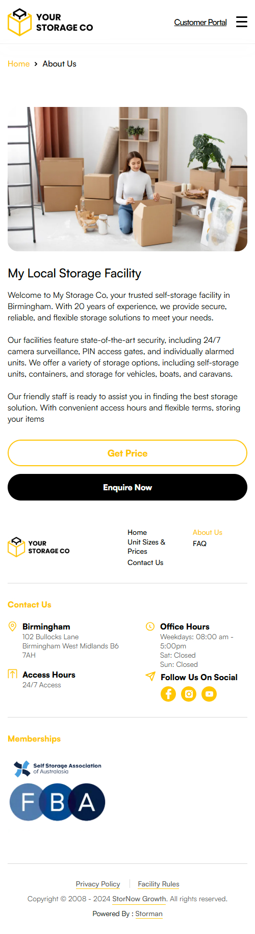 Manage the address, working hours, and access hours in StorMan, and they will be automatically synced to the site.